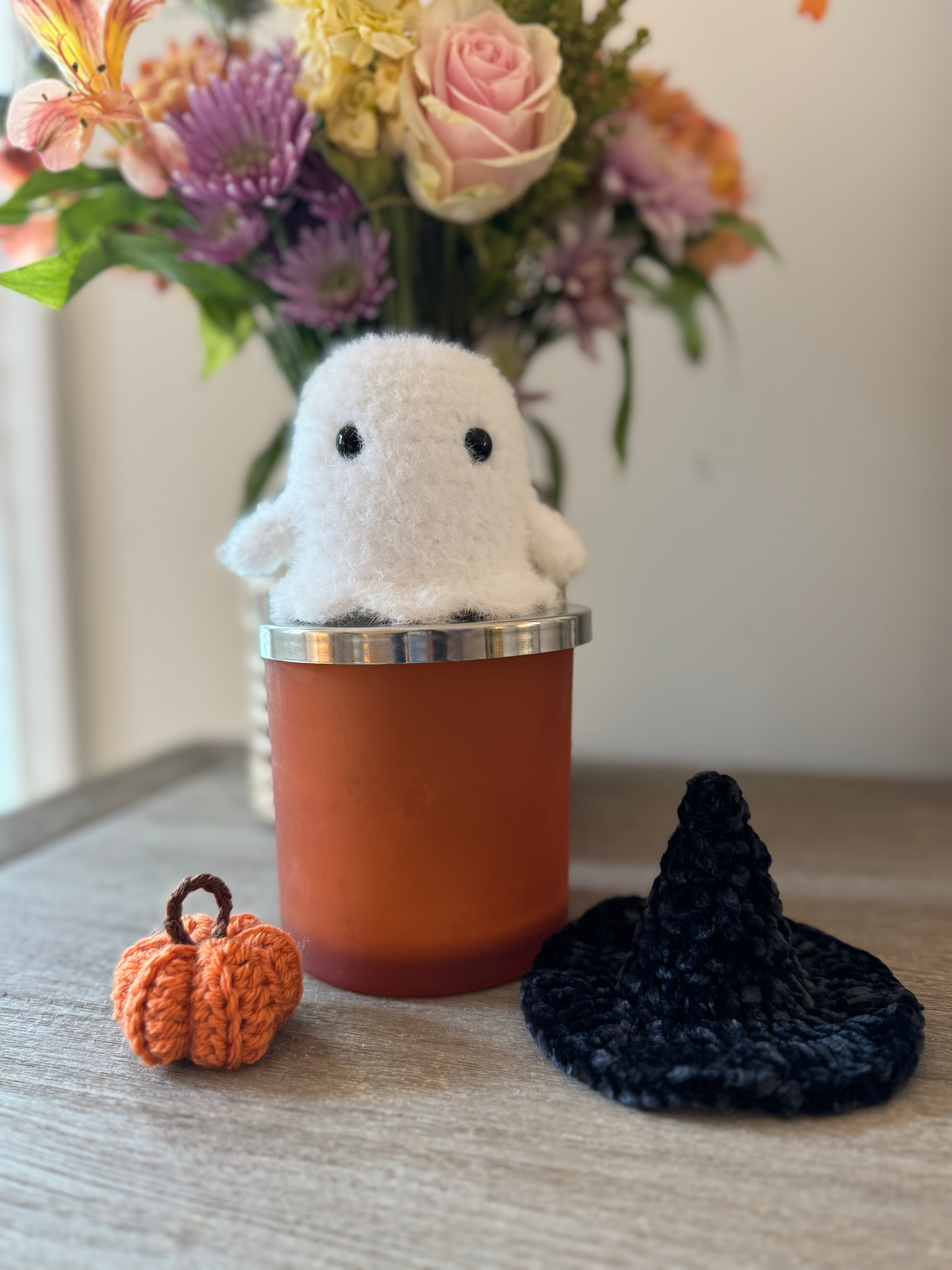 Crochet your own 'Tiny lil Fuzzy Ghost' in just 2 hours — complete with a mini pumpkin purse and witch hat! Perfect for Halloween decorating or gifting, this pattern creates an fuzzy ghost that’s low-sew, quick to make, and hauntingly adorable (lol get it?).